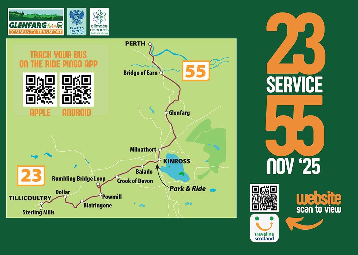 In April 2023, Glenfarg Community Transport Group took over the The 55 Bus service between Glenfarg and Kinross. The daytime 56 service operating between Kinross and Perth through Glenfarg had been withdrawn in 2020 and was replaced by the 55 service between Glenfarg and Kinross operated by Earnside Coaches. Due to retirement, the Earnside service ceased in March 2023.